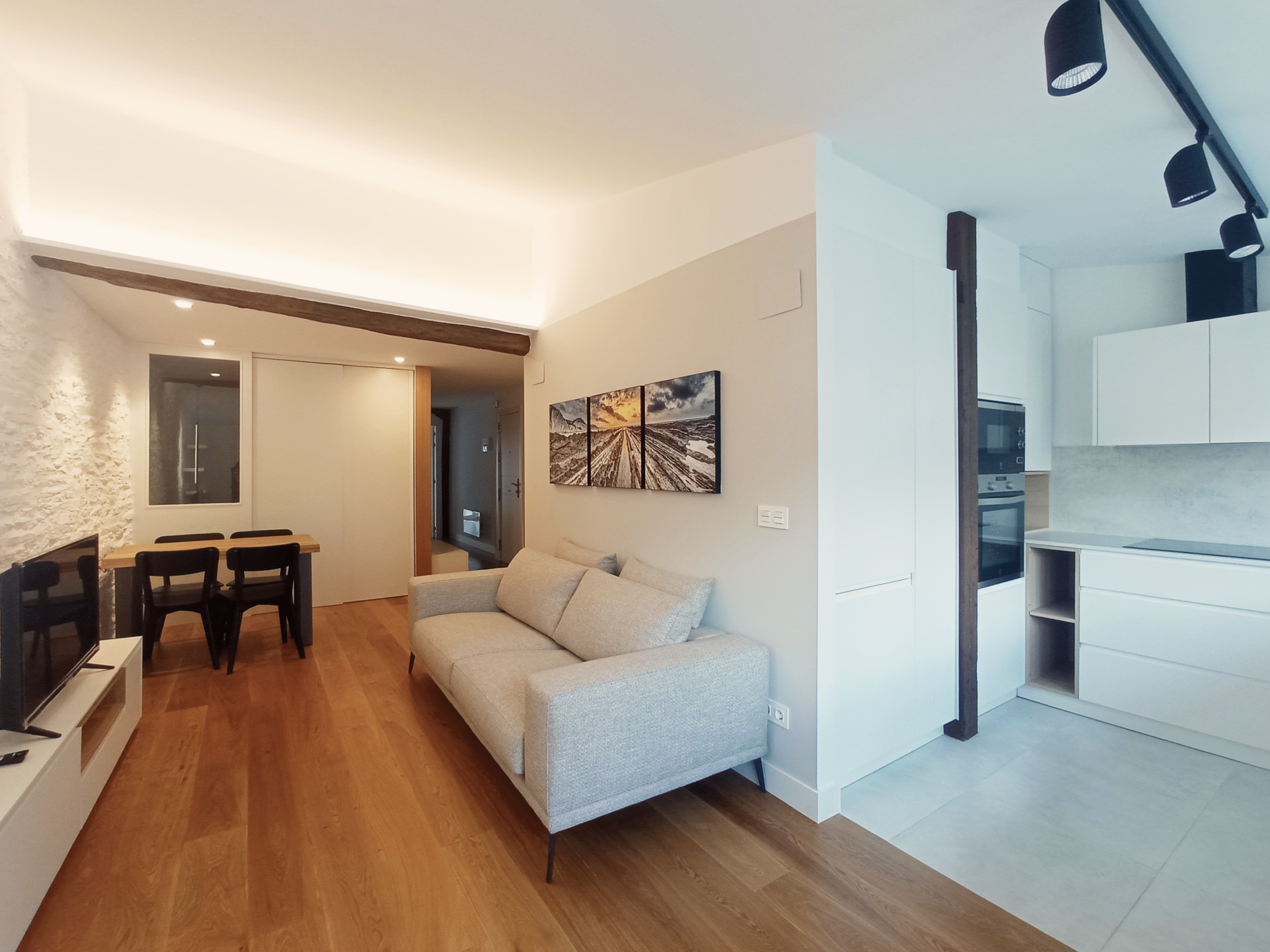 Al dejar a la vista elementos originales, hemos conseguido espacios con gran personalidad. Hemos descubierto la estructura de madera original del edificio a lo largo de toda la vivienda y, en el espacio de cocina-salón-comedor, hemos dejado vista la textura de la piedra del muro de carga tradicional, aprovechando las texturas que nos ofrece el propio edificio. La piedra se ha pintado con pintura de cal para aportar luminosidad al espacio de día.