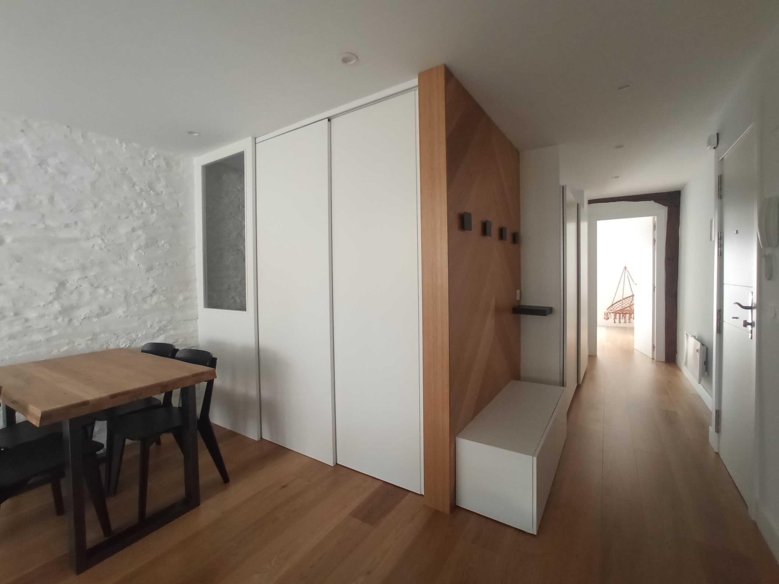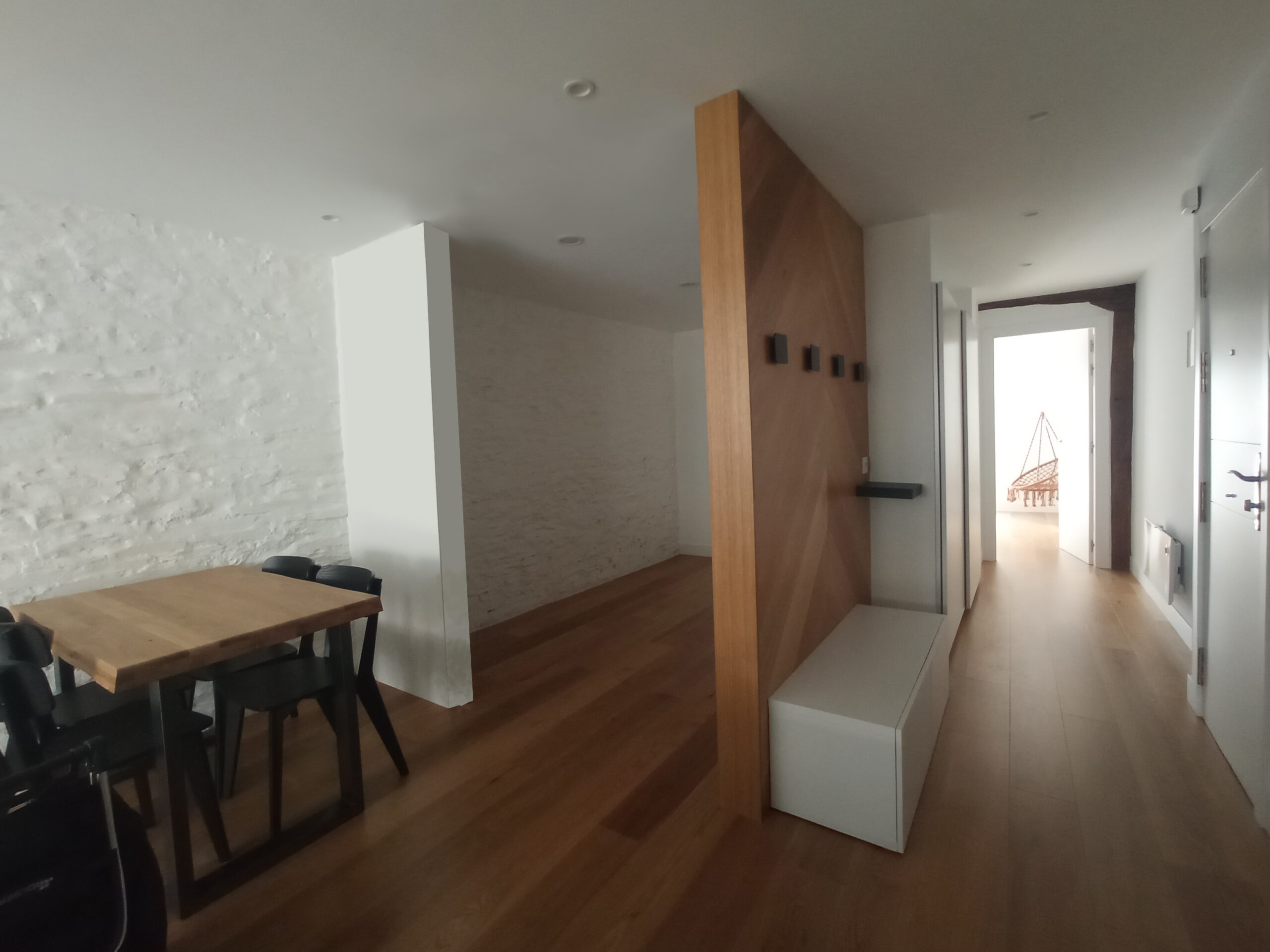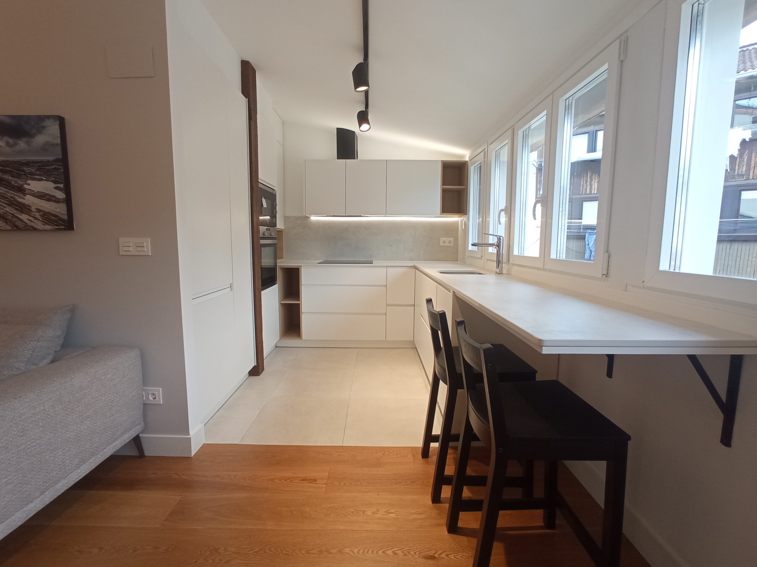 La vivienda se encontraba bajo una buhardilla de la misma propiedad, sin ningún uso, por lo que decidimos demoler parte del forjado intermedio y crear un espacio de cocina-salón de doble altura. De este modo, a cambio de perder la superficie de una buhardilla inservible, dotamos al espacio de día de la vivienda de una mayor amplitud y compensamos la escasa altura original de la casa.