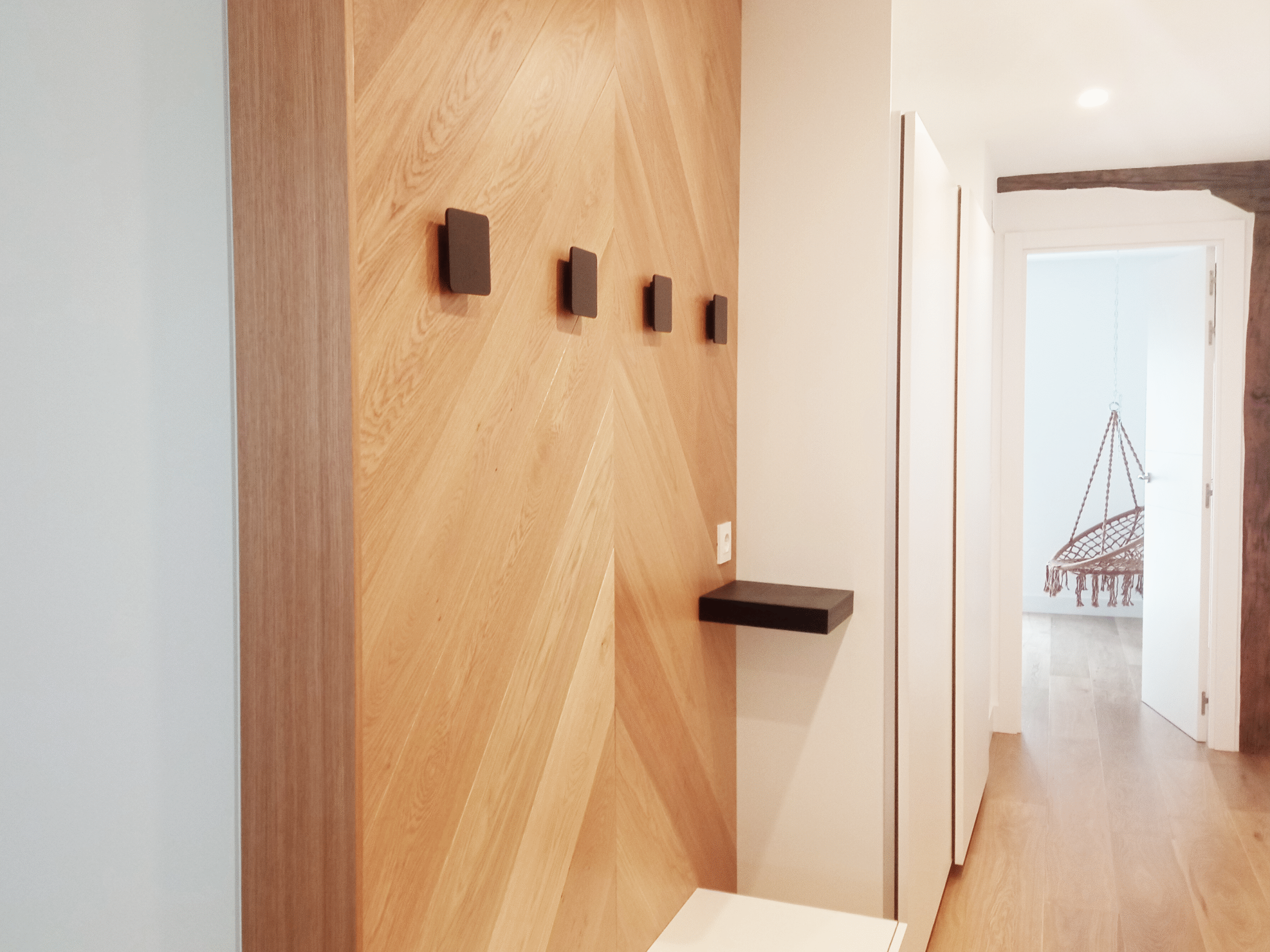 Hemos creado una zona de despacho integrado en la sala de estar, con la posibilidad de independizarla en caso necesario. La separación, mediante un cerramiento móvil de vidrio, garantiza la iluminación natural del despacho. Se han incorporado espacios de almacenamiento tanto en el propio cerramiento como en el dormitorio, manteniendo los tonos blancos y los acabados en madera del conjunto de la vivienda, con mobiliario adaptado a las necesidades del cliente.