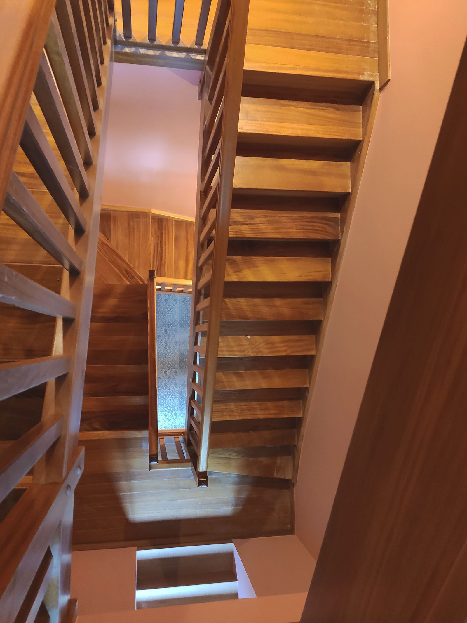 Al mismo tiempo, pusimos en marcha un tratamiento con inyecciones y cebos contra las termitas para erradicar el ataque de las mismas de la mano de una empresa experta. Al tratarse de un emplazamiento al borde del rio, la humedad era alta en las plantas bajas, sobre todo en el semisótano. Como medida contra el ataque de las termitas, alejamos la estructura de madera de la fuente de humedad, utilizando piezas de acero en las columnas sustituidas en la planta sótano.