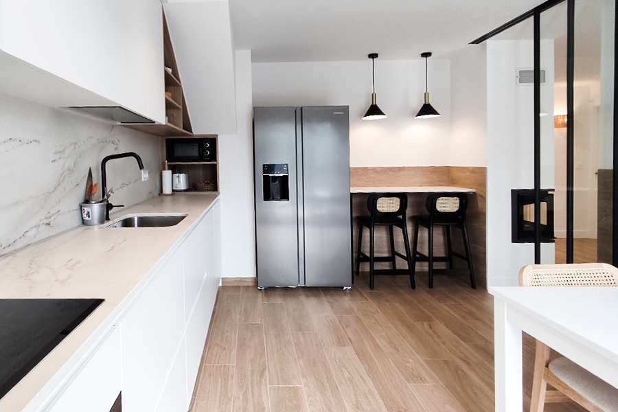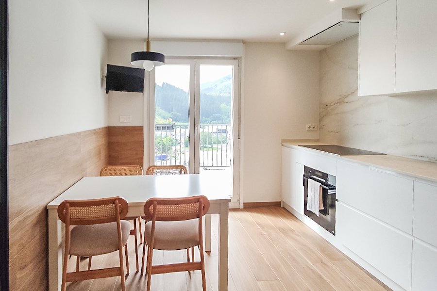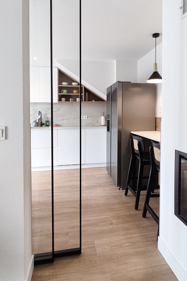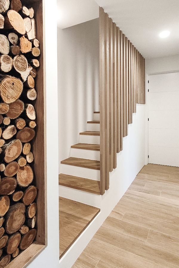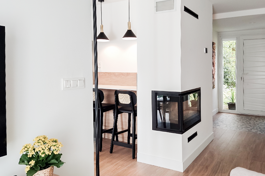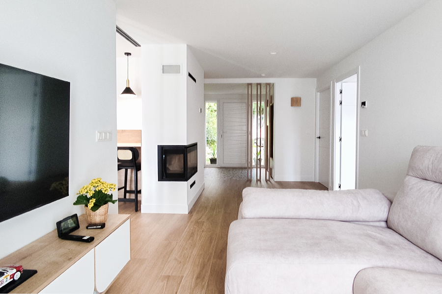 Además, se han aislado las fachadas y se ha combinado el sistema de aerotermia con suelo radiante para mejorar la eficiencia energética de la vivienda. En el centro de la casa se ha instalado una chimenea, que permite disfrutar del calor del fuego y distribuirlo de manera uniforme por todo el hogar. En este proyecto, la eficiencia del diseño y la mejora energética han sido los ejes principales, dando lugar a un espacio confortable y sostenible.