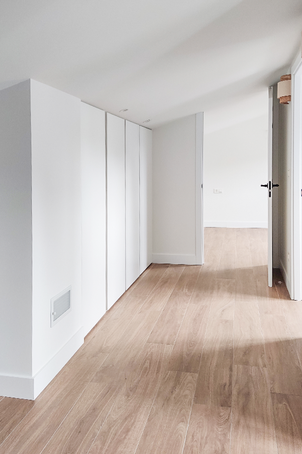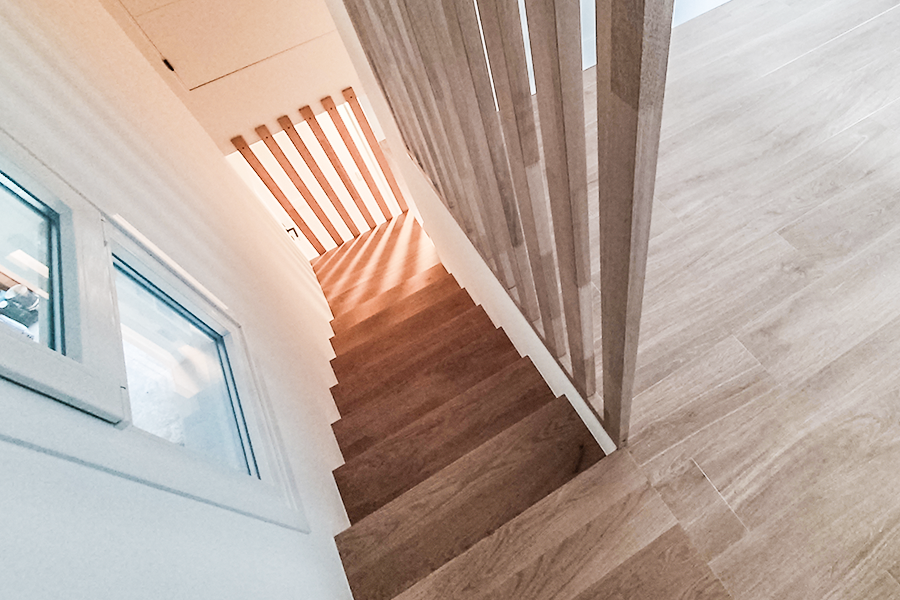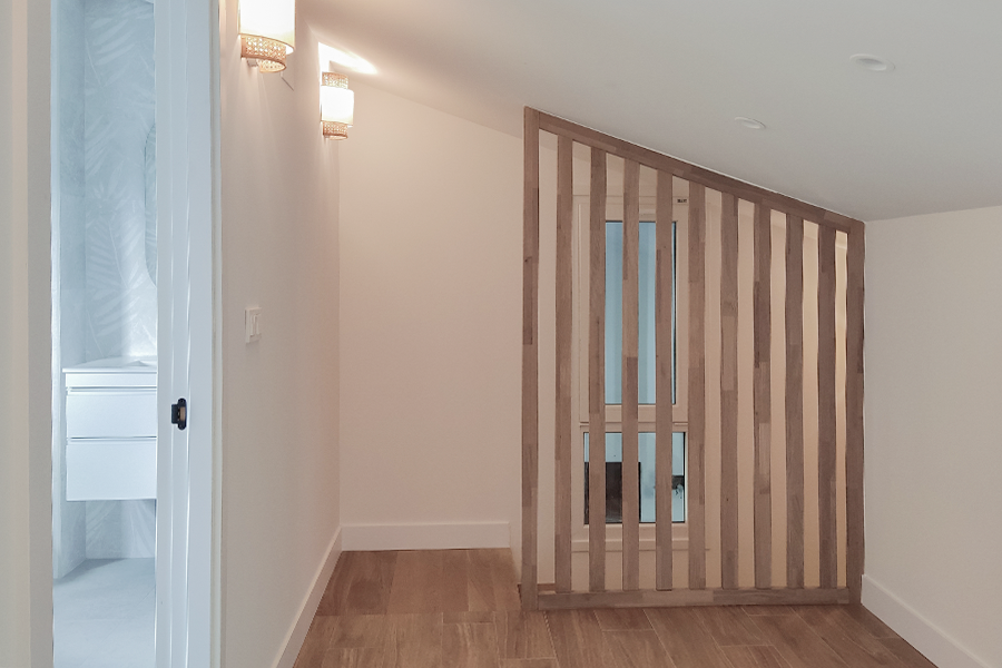 En el proyecto de reforma de este dúplex, se ha reconfigurado la estructura para trasladar la escalera a una nueva ubicación. La composición estructural original de los forjados era muy simple y presentaba fisuras. Para generar el nuevo hueco de la escalera y determinar si la estructura soportaría el peso del sistema de suelo radiante que el cliente deseaba instalar, fue necesario realizar pruebas de carga mediante un laboratorio especializado. Posteriormente, se llevó a cabo la intervención estructural de refuerzo necesaria.