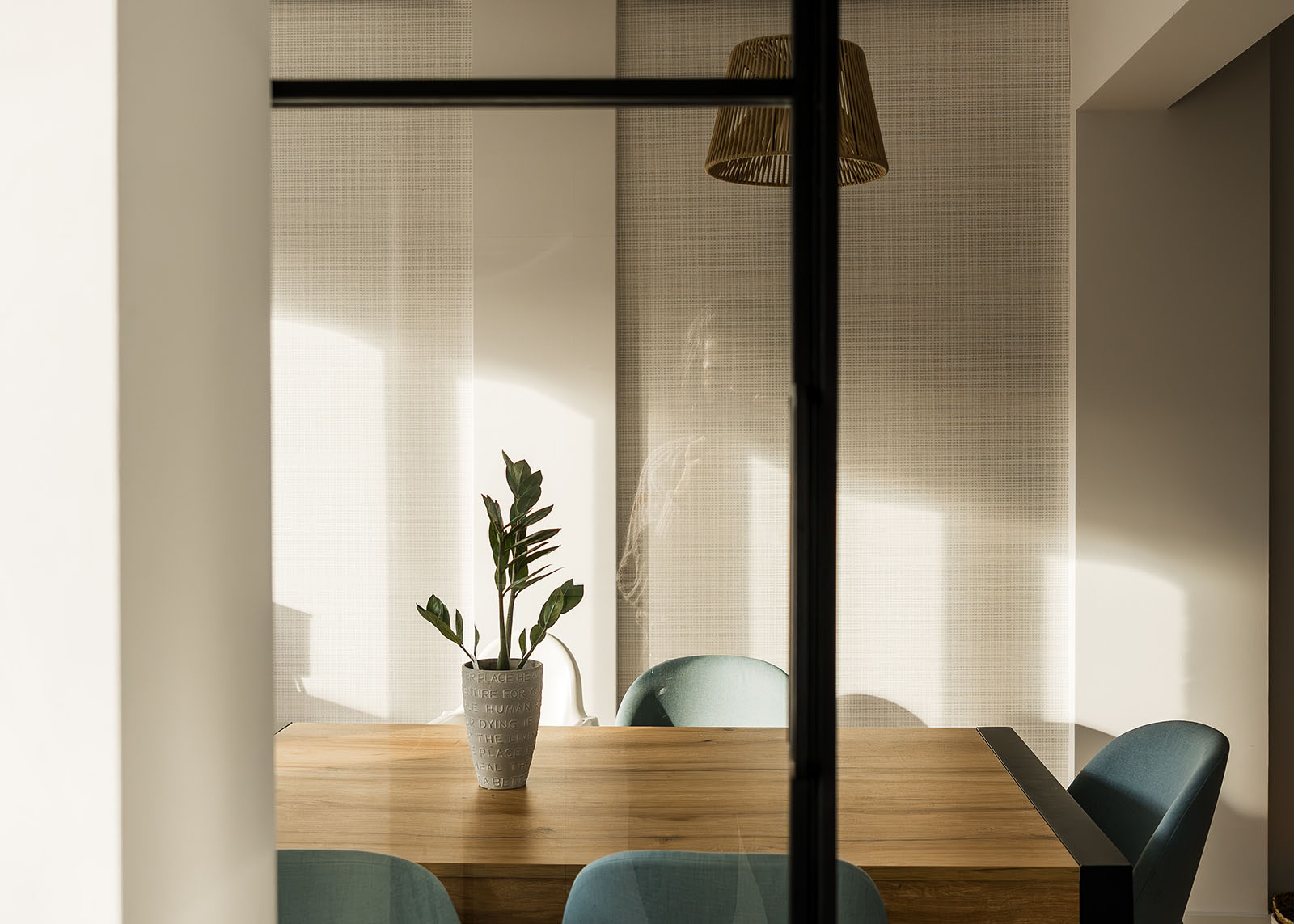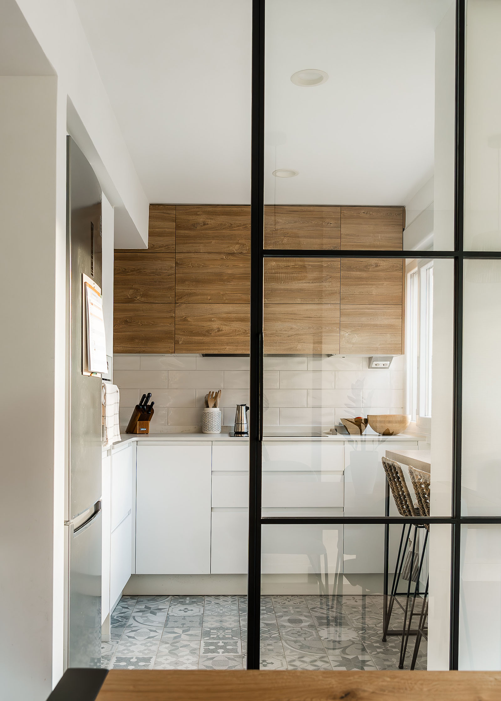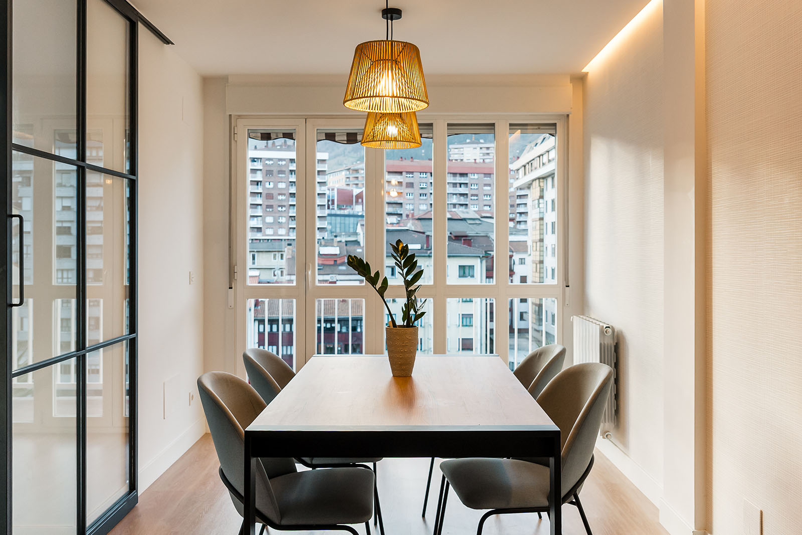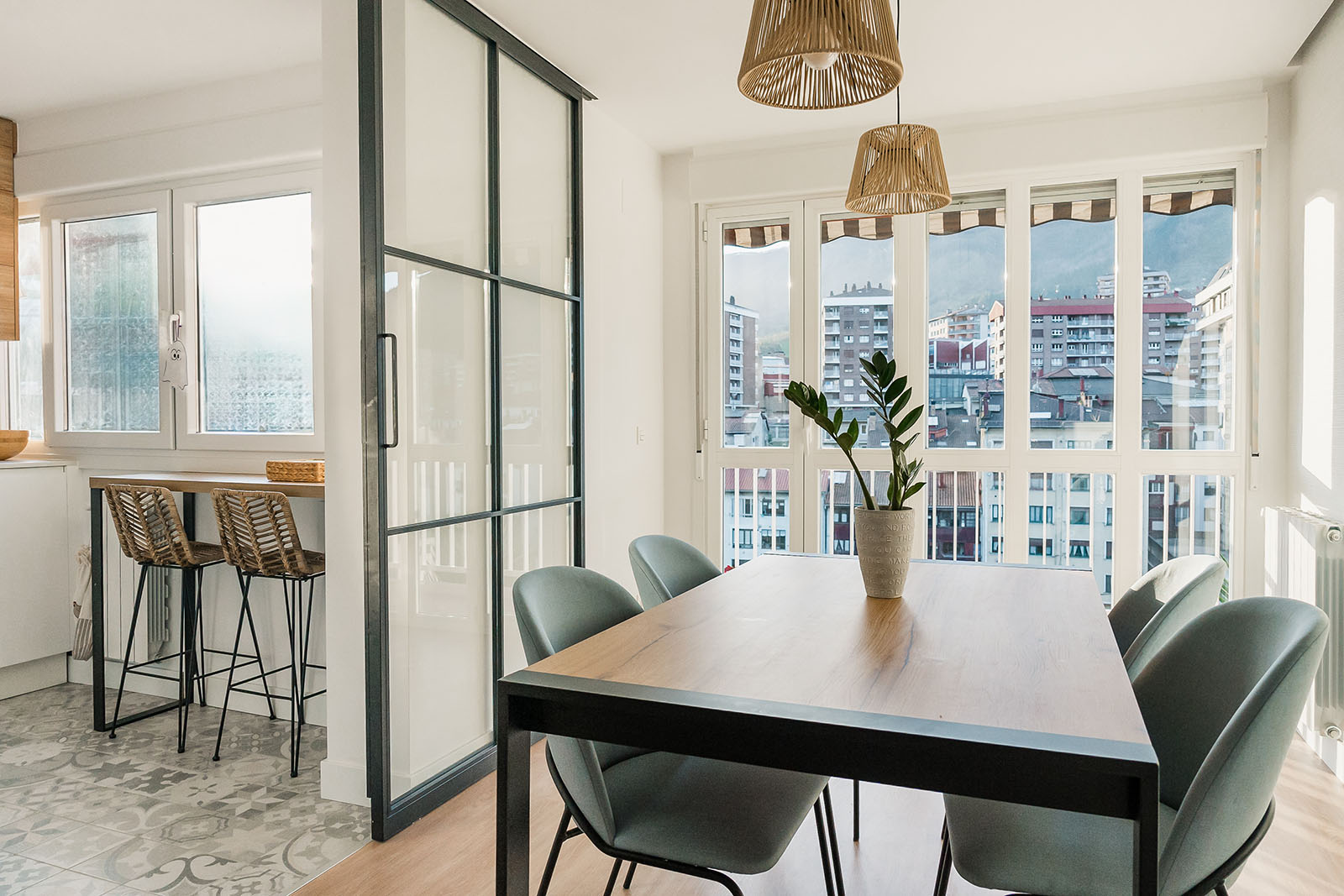 Barne-banaketa berria antolatzeko abiapuntua āLā formako eskilara birdiseinatu eta ibilbide zuzena duen eskilara batengatik ordezkatzea izan da. Jangela eta egongelaren arteko banaketak eraitsi eta hegoaldeko fatxadaren argitasuna baliatu dugu eguneko espazio atseginagoa sortzeko. Sukaldea jangelaren ondoan kokatu bada ere, isteko aukera eman diogu beirazko ate labainkorren bidez. Eguzkitan gosaltzeko barra bat ere sortu dugu sukalde barruan.